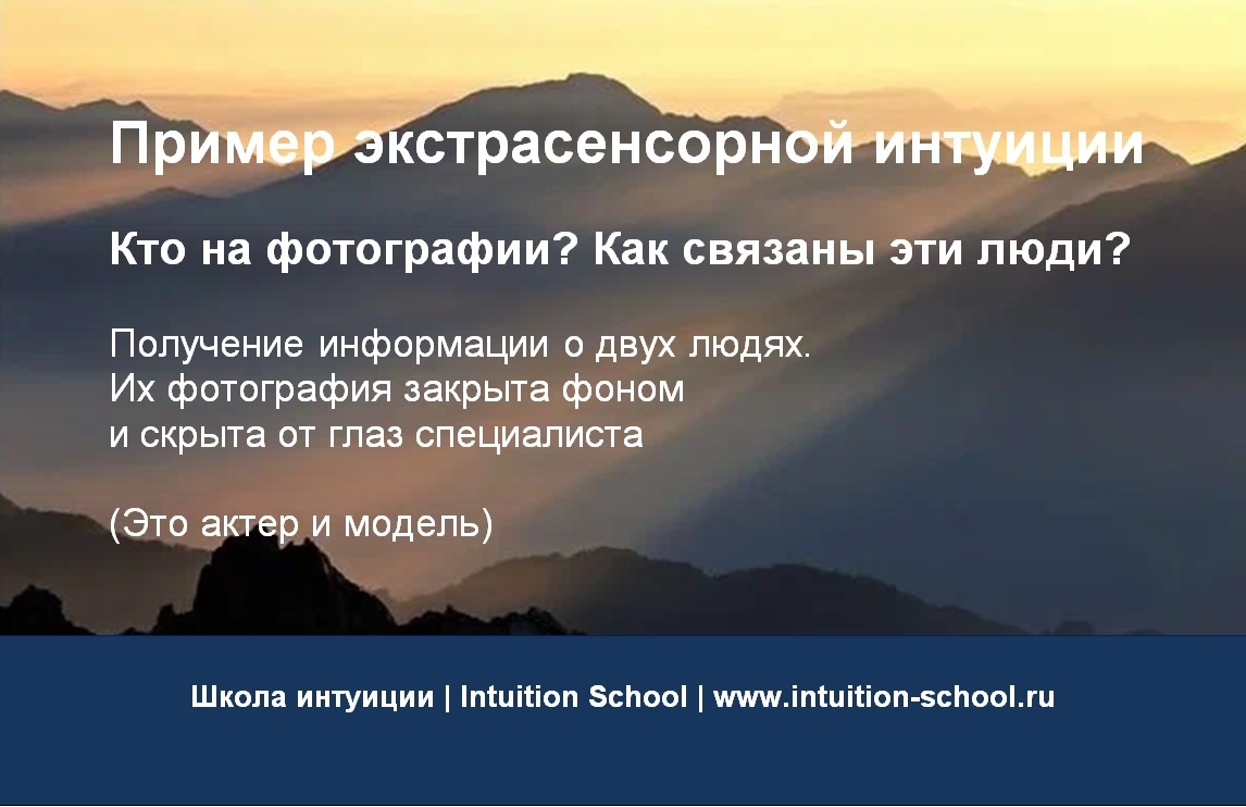 Дорогие друзья, хочу поделиться с вами примером экстрасенсорной интуиции. Дата Март 2026 г. Условия Передо мной фотография двух человек, которая закрыта фоном. Моя задача – получить информацию о том, кто изображен на фотографии и как связаны эти люди. Я знала только то, что это фотография двух людей. Запрос Кто на фотографии? Как связаны эти люди? Процесс Я выражаю намерение получить информацию по запросу. В течение нескольких минут происходит погружение в измененное состояние сознания. И подсознание начинает передавать информацию: на мысленном экране возникают зрительные образы, возникает внутренний голос, который передает сообщения, возникают понимания. Я записываю поступающую информацию. Сообщение подсознания Мужчина в черных очках и черной шляпе. *** На сцене с микрофоном. В блестящем костюме. Ведущий и/или певец. Знаменитый человек. *** Играет убийцу. *** Мужчина в аэропорту. Мужчина держит в руках портфель. В портфеле много денег. Махинации, гангстерство. Богат. *** Женщина с пыш
