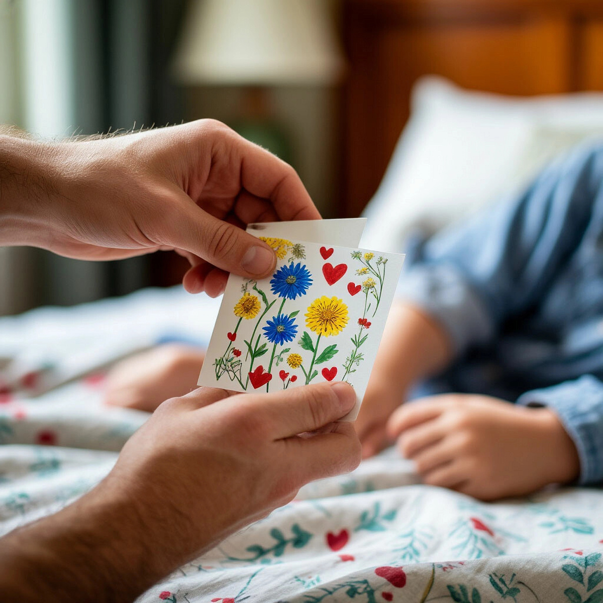 В руках у него был квадратный листок плотной бумаги. Акварельный. С одной стороны — нарисованные цветы. Синие васильки и жёлтые одуванчики. С другой — сердечки. Красные, розовые, одно с блёстками.