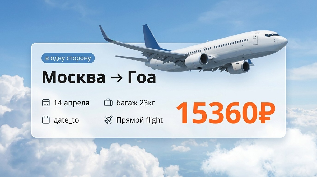 • Москва — Гоа, 14 апреля, багаж включен — 15 360₽ • Санкт-Петербург — Тбилиси, с 3 по 11 апреля, с багажом — 27 487₽ • Москва — Сочи, с 7 по 21 апреля, багаж в стоимости — 11 531₽ • Сочи — Ереван, с 10 по 17 апреля, включая багаж — 14 972₽ Места по таким тарифам быстро заканчиваются, поэтому рекомендуем не откладывать покупку.