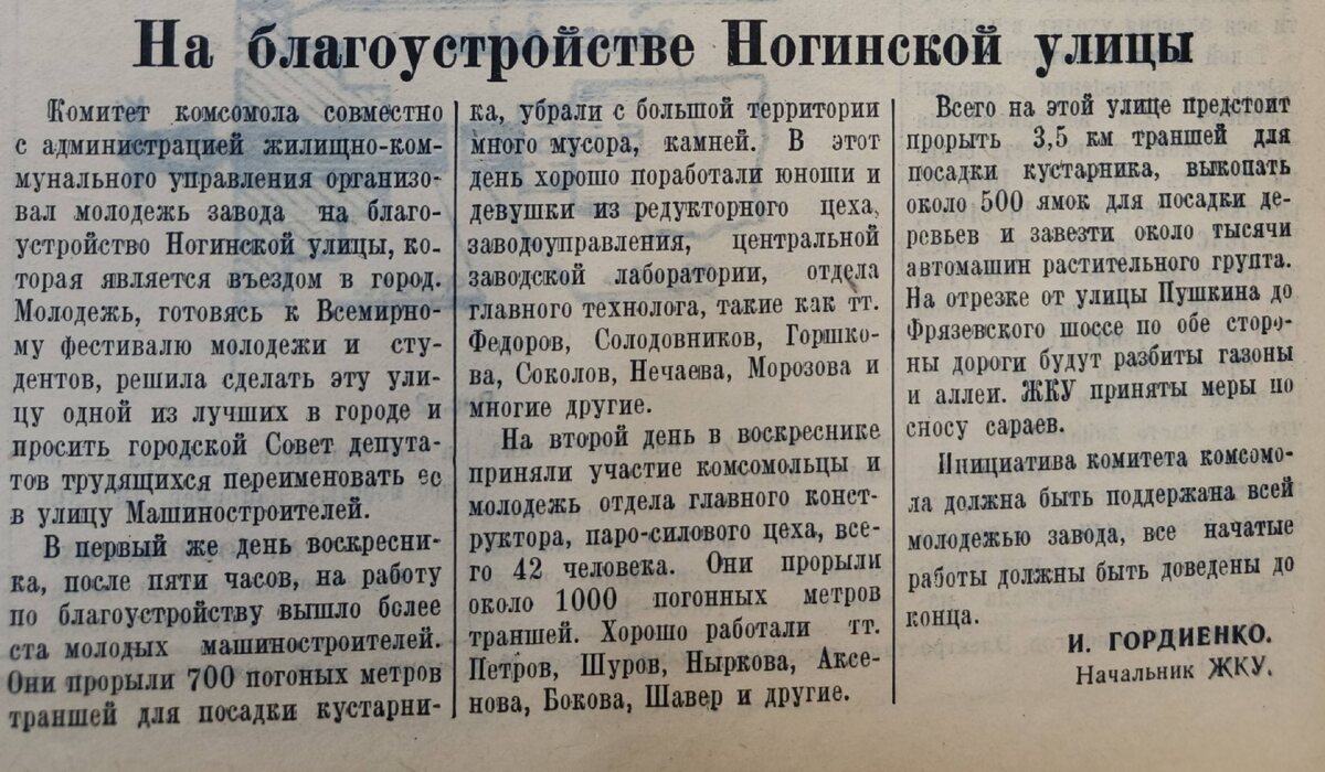 Эта статья вышла в газете "Сталинец" ЭЗТМ в 1957 году. Обратите внимание: улицу Ногинскую хотят переименовать в улицу Машиностроителей. Случилось другое: в 1965 году эта улица получила имя Героя Советского Союза Петра Андреевича Жулябина✌️
