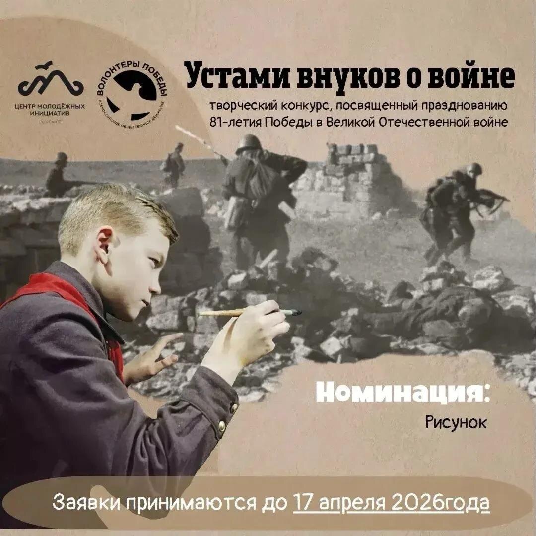 » 📍Центр молодежных инициатив приглашает принять участие в творческом конкурсе, посвященном 81-й годовщине Победы в Великой Отечественной войне 1941–1945 годов. 📌Кто может участвовать: Жители и гости Корсаковского района в возрасте от 10 до 35 лет. 📎Что можно сделать? Выбрать одну из трех номинаций: «Рисунок». «Чтение стихотворения собственного сочинения». «Чтение стихотворения». 👌Зачем это нужно? Чтобы сохранить историческую память о Великой Отечественной войне, Второй мировой войне и Специальной военной операции, а также дать возможность молодежи проявить свои таланты. 🔔Когда подавать? Заявки принимаются до 17 апреля. Узнать подробности и ознакомиться с условиями можно: 🔗 по ссылке 📞 по телефону: 8 (42435) 4-00-59 Заявки принимаются на почту maucmi@sakhalin.gov.ru. 🧒Подписывайтесь на Мой Корсаков в MAX и будьте в курсе событий!