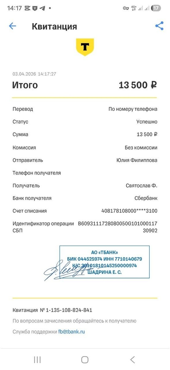 Перевела Святославу 13 500 на 25 акб для Кота.