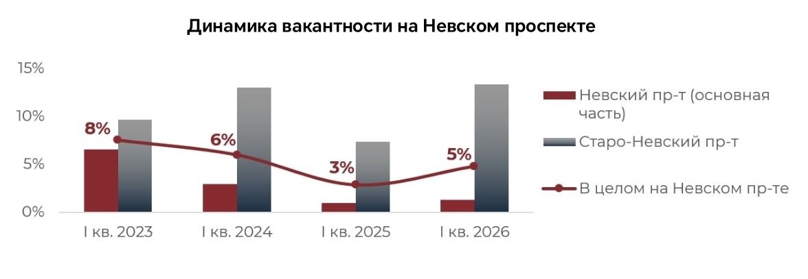 На Невском проспекте в Санкт-Петербурге, главном пешеходном торговом коридоре России-матушки арендаторы закрывают бизнес быстрее, чем открывают. NF Group опубликовали свежие данные по стрит-ритейлу Петербурга за I квартал 2026 года - и картинка так себе. 🕳️ Общая вакантность на Невском подскочила с 3% до 4,8%. Казалось бы, немного. Но год назад основная часть проспекта показывала менее 1% свободных площадей - это был рекорд. Сейчас - уже 1,5%. Тренд развернулся. 🏛️ Старо-Невский - вообще зона бедствия: вакантность взлетела с 8% до 13%. Закрытий вдвое больше, чем открытий (11 против 5). «Дом фарфора», который в 2024-м с помпой занял площади Dior, уже закрылся. 🪦 На основной части проспекта тоже не праздник. Магазин Calzedonia, простоявший на Невском, 73-75 больше десяти лет - закрыт. Рестораны, бары, кофейни - закрываются. А кто приходит на их место? Сувенирные лавки. 36% всех новых открытий - это магнитики и матрёшки. 💸 Ставки аренды - от ₽3 до ₽15 тыс./м2/мес с НДС. Индексация
