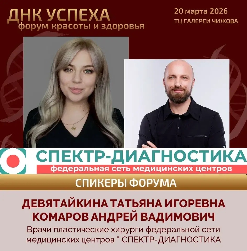 Мы – на форуме «ДНК успеха»: экспертный взгляд на красоту и качество жизни! 📍20 и 21 марта мы стали участниками форума красоты и здоровья «ДНК успеха». Событие, которое объединило профессионалов, и мы рады быть его частью! Особая благодарность президенту форума Любови Васильевне Рощевкиной за приглашение и прекрасную организацию! Для нас это возможность обменяться опытом, услышать свежие взгляды, а главное – поделиться тем, что наработано годами практики. На форуме наши эксперты выступили с темой: «Визуальный капитал: как внешняя красота влияет на качество жизни и уверенность в себе». 🗣 Татьяна Игоревна Девятайкина – руководитель центра пластической хирургии в «Спектр-Диагностика» Воронеж, пластический хирург. 🗣 Андрей Вадимович Комаров – пластический хирург сети клиник «Спектр-Диагностика». Мы рады, что наши врачи – не только высококлассные специалисты, но и спикеры, готовые делиться своими знаниями. «Спектр-Диагностика» расширяет горизонты – спасибо, что вы с нами! 🙌