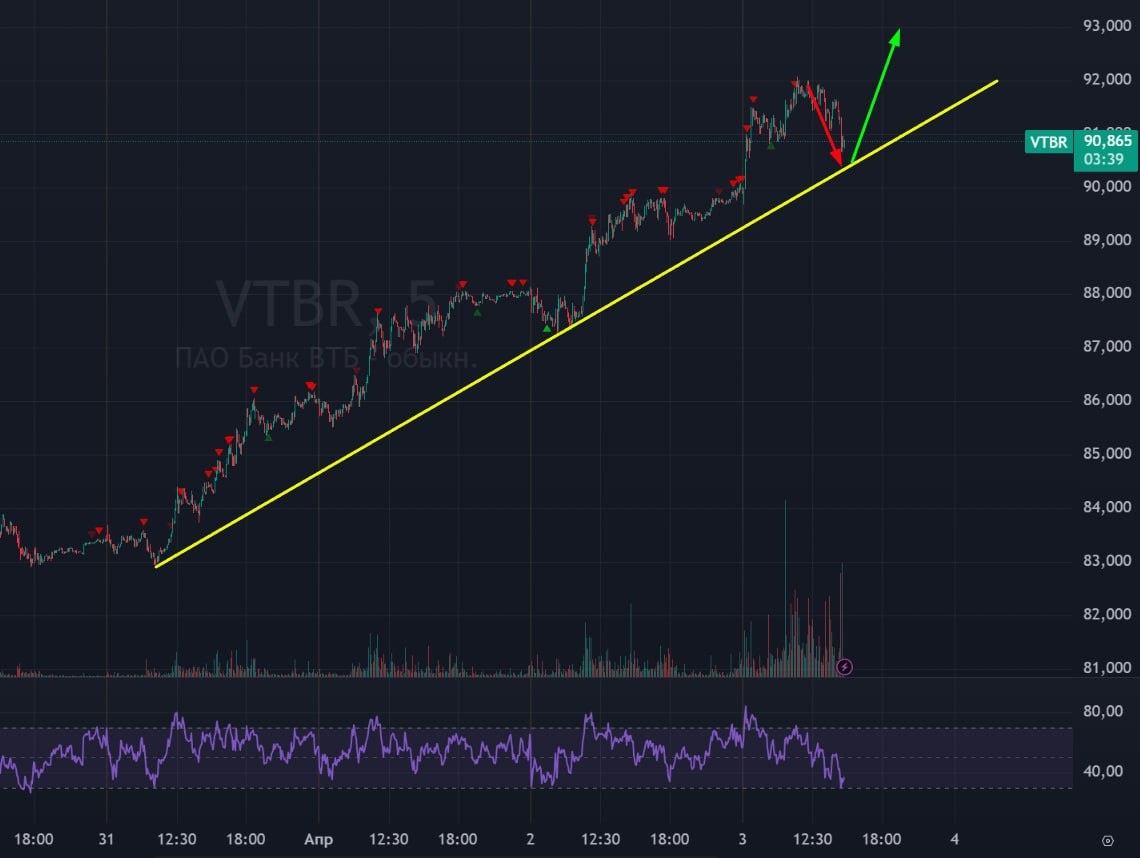 🏦 ВТБ 🟢 Ну в целом почти до цели дошли, немного осталось до линии. Что дальше? Дальше все еще вверх. Решение по дивам будет 15го апреля, так что еще не все участники рынка достаточно уплотнились в этой ракете. 🚗 Ждал откат в ВТБ, получил его. На следующей неделе жду на 93, а потом кидалово с дивами. #втб #vtbr #bogdanoffinvest $VTBR $VBM6 $VBU6