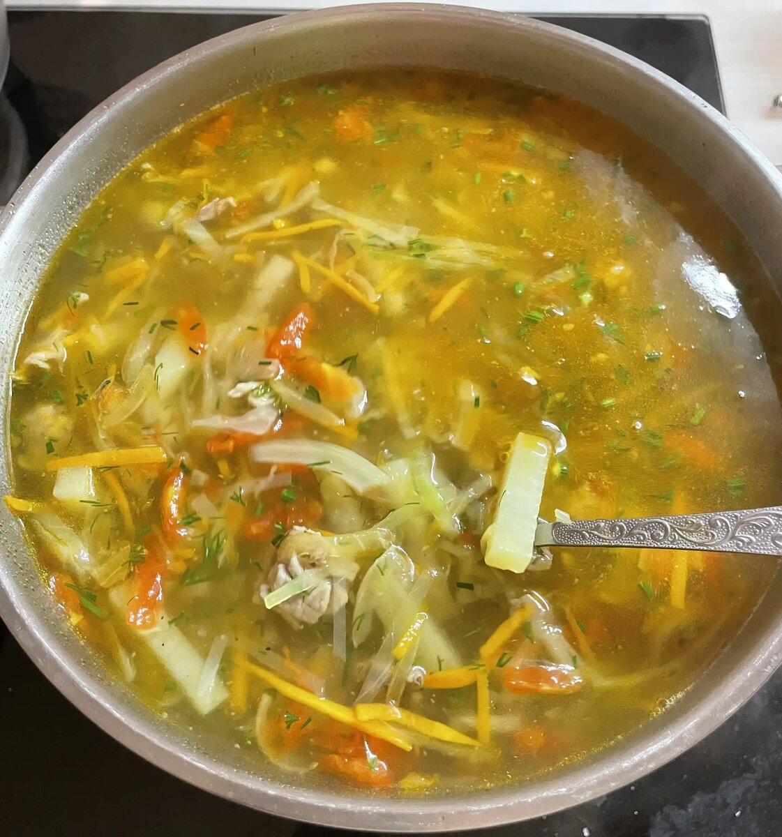 Приветствую вас, мои хорошие!) Рассказываю обещанный рецепт щей, которые я готовила параллельно с куриными отбивными (https://dzen.ru/a/ac-g_Gho3yp0ZbQQ). Да-да, я многозадачная кулинарная единица 😄 Для начала приготовим бульон (как его готовить — читайте здесь https://dzen.ru/a/abfJhKqqyFGbPyo3). Я и моя семья любим щи на свинине с косточкой — да побольше мяса все хотят))) Поэтому мяса берите больше, не стесняйтесь! А лучше всего — на свиных рёбрышках! Там и мясо, и душа😃, и наваристость. На 3 литра готовых щей нам понадобится: Подготовка: Картофель нарезаем брусочками, капусту, морковь, лук и помидоры— тонкой соломкой. В принципе, щи готовятся почти так же, как и борщ (https://dzen.ru/a/ab-tGYUsYUTS_iQ2), только не кладём свёклу и томатную пасту. А помидоры нарезаем, а не измельчаем. И в отличие от борща, эти щи можно не настаивать, а кушать сразу — с пылу с жару, пока они горячими шепчут «съешь меня» 🥣 Зажарка: Лук сначала кладём на разогретую сковороду, через 1–2 минуты добавляе