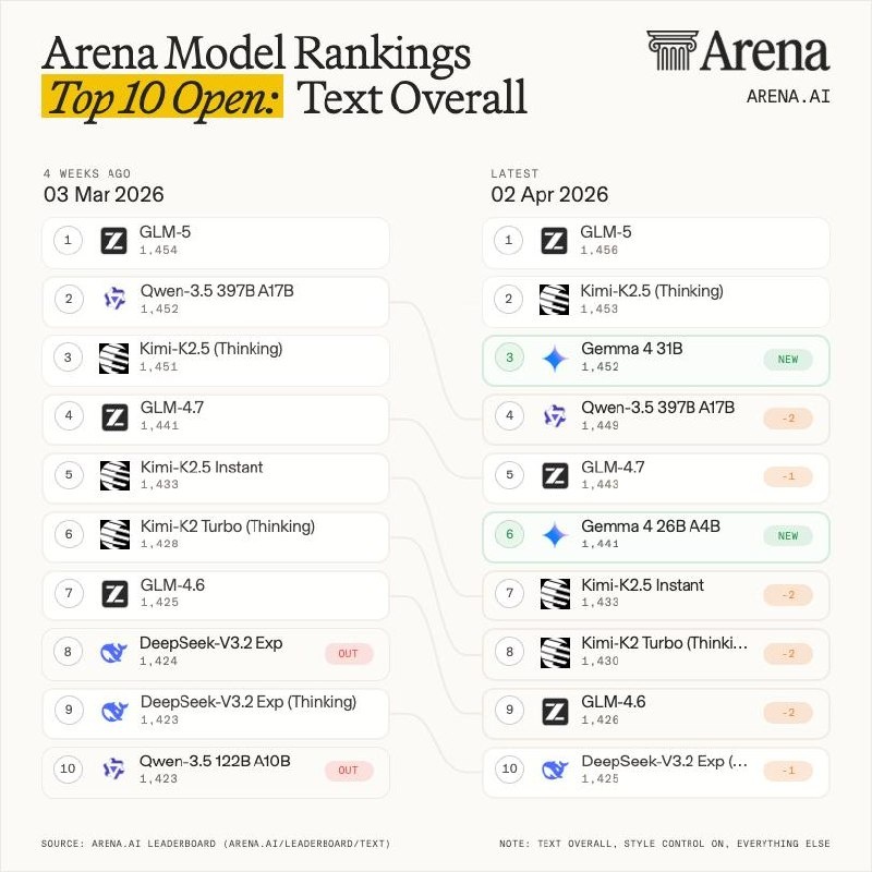 Gemma 4 от GoogleDeepMind дебютировала на 3 и 6 местах в open source leaderboard, став моделью №1 среди open source моделей из США