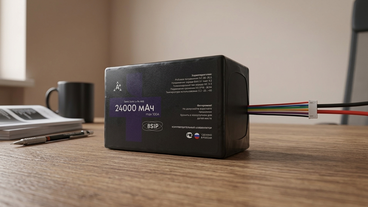 Рынок аккумуляторных технологий переживает важный этап развития: на смену классическим литий-ионным решениям постепенно приходят полутвердотельные батареи (Semi-solid). Это промежуточное звено между привычными системами с жидким электролитом и перспективными полностью твердотельными аккумуляторами, которое уже доступно в виде серийных продуктов. Один из таких примеров — полутвердотельный аккумулятор 24 000 мА·ч в конфигурации 8S1P с элементами удельной энергоёмкости 360 Вт·ч/кг. В классическом литий-ионном аккумуляторе используется жидкий электролит, который обеспечивает перенос ионов между анодом и катодом. В полутвердотельных системах часть жидкого электролита заменяется гелевыми или твердофазными компонентами, что позволяет повысить энергоёмкость и безопасность без кардинального усложнения конструкции. По сути, это эволюция привычных Li-Ion: сохраняются знакомые характеристики, но улучшаются стабильность, ресурс и плотность энергии. Полутвердотельный аккумулятор этой модели ориентир