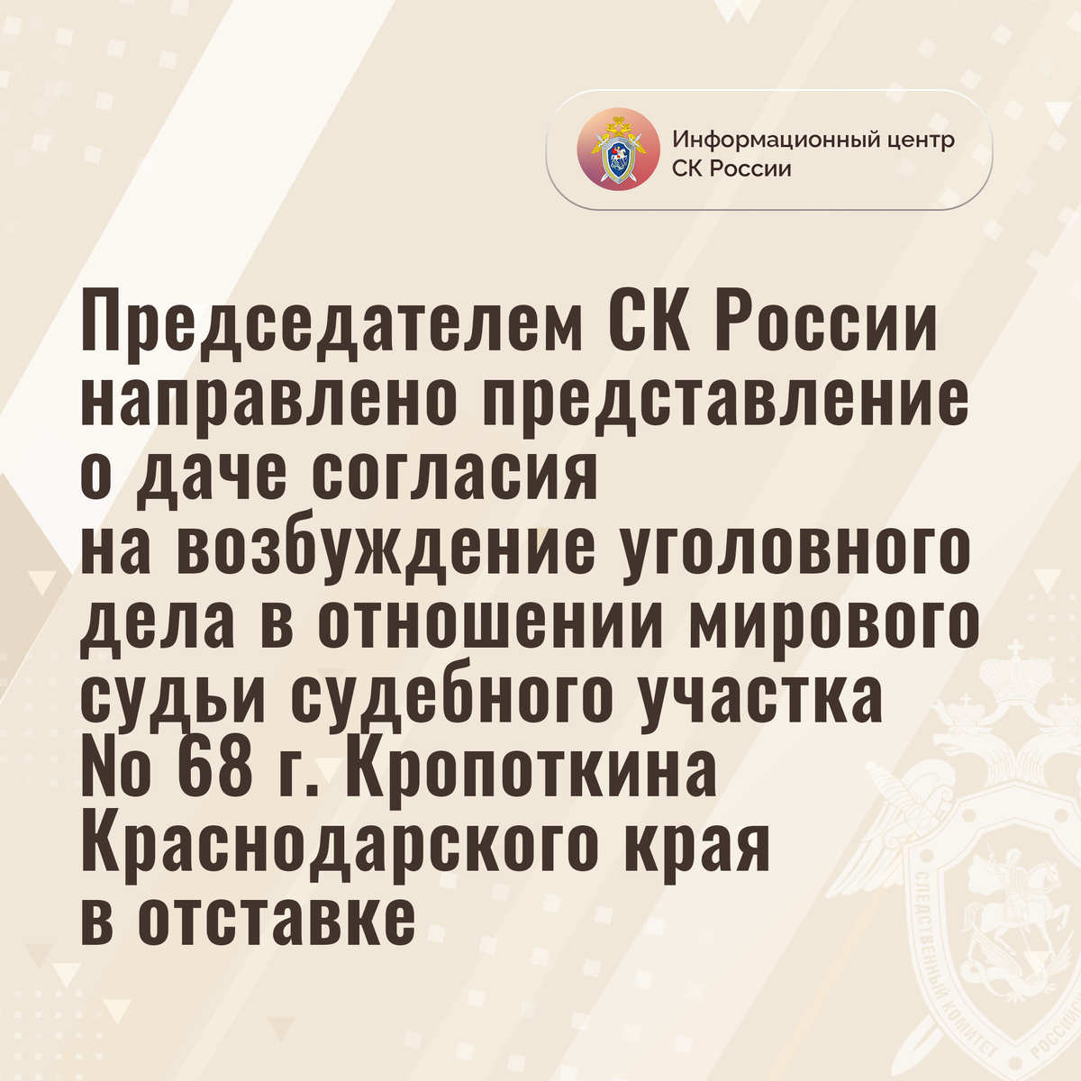 Председателем СК России направлено представление о даче согласия на возбуждение уголовного дела в отношении мирового судьи судебного участка