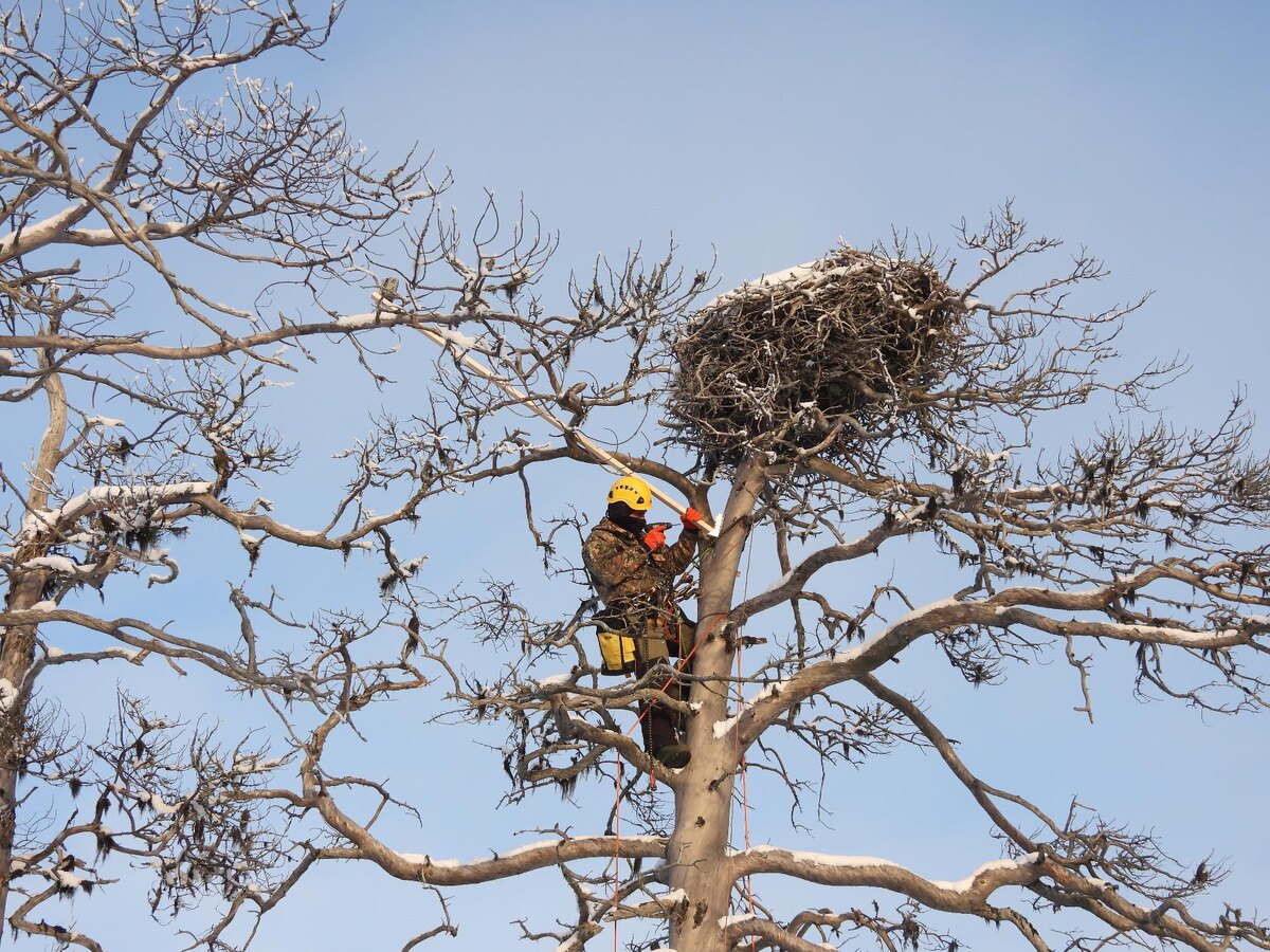 Специалисты национального парка «Онежское Поморье» вместе с приглашённым орнитологом-экспертом Мирославом Бабушкиным устанавливают фотоловушки у гнёзд редкой хищной птицы — скопы. Это необходимо для изучения жизни пернатых после зимовки в Африке и их адаптации к суровым условиям Севера. Заместитель директора по научной работе Дарвинского государственного природного биосферного заповедника Мирослав Бабушкин и охотовед Павел Футоран установили и заменили карты памяти и аккумуляторы на девяти фотоловушках. С помощью альпинистского снаряжения эксперт взобрался на 8–10-метровые сосны, чтобы разместить камеры рядом с гнёздами.
