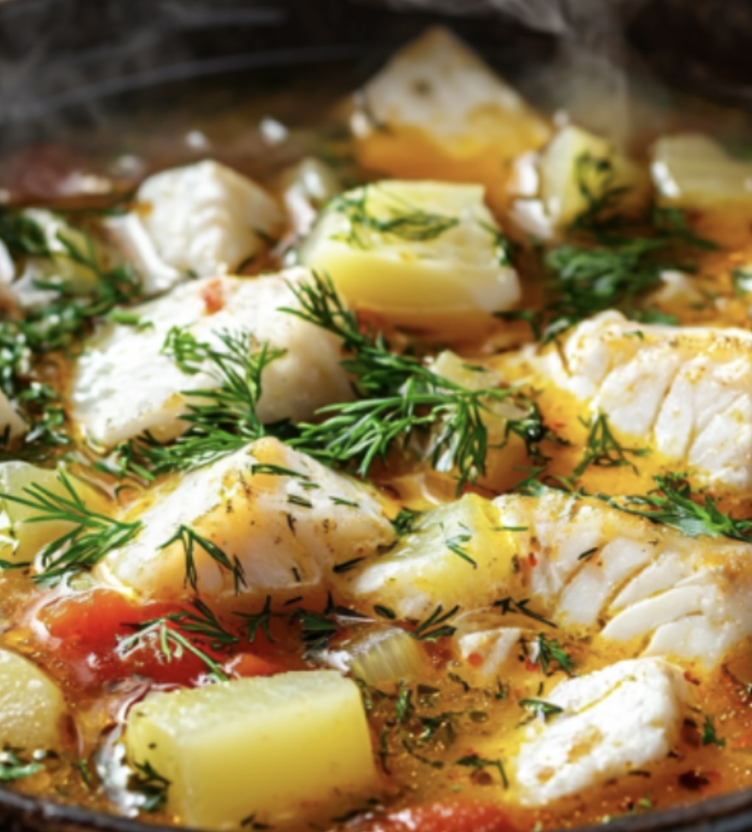 - Добавьте минтая в кастрюлю, варите ещё 10–15 минут до готовности рыбы.