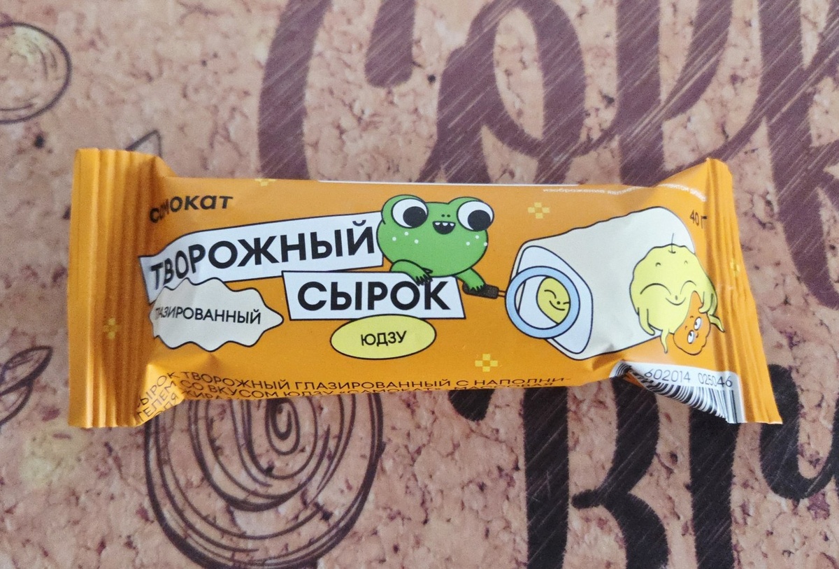 🍋Творожный сырок Самокат со вкусом юдзу, глазированный🍋 Давно сырки не покупала. А вот такой еще не пробовала. В ассортименте появились пара новых вкусов и конечно я их купила. Цитрусы моя слабость, а когда они в любимой еде - вдвойне приятно. Этот сырок дочь не оценила, она любит без начинки, зато мне больше досталось))). Пакетик очень яркий, жизнерадостный. На картинке юдзу и еще какая-то странная зеленая аморфная лягушка. Все так позитивненько, весело, что захотелось быстрее попробовать сырок. Творожный сырок в сладкой глазури. Внутри — цитрусовый наполнитель со вкусом лимона, мандарина и юдзу. Массовая доля жира в молочной части продукта — 16% 🔸️Изготовитель: АО Дмитровский Молочный Завод, Россия 🔸️Масса нетто: 40 г 🔸️Срок хранения всего 1 месяц Сырок выглядит очень аппетитно. Аккуратно залитый белой глазурью так и манит "Съешь меня!". В разрезе сырок тоже заманчив. Нежная белая творожная масса и в серединке цитрусовая начинка. Запах приятный - цитрус немного, но чувствует