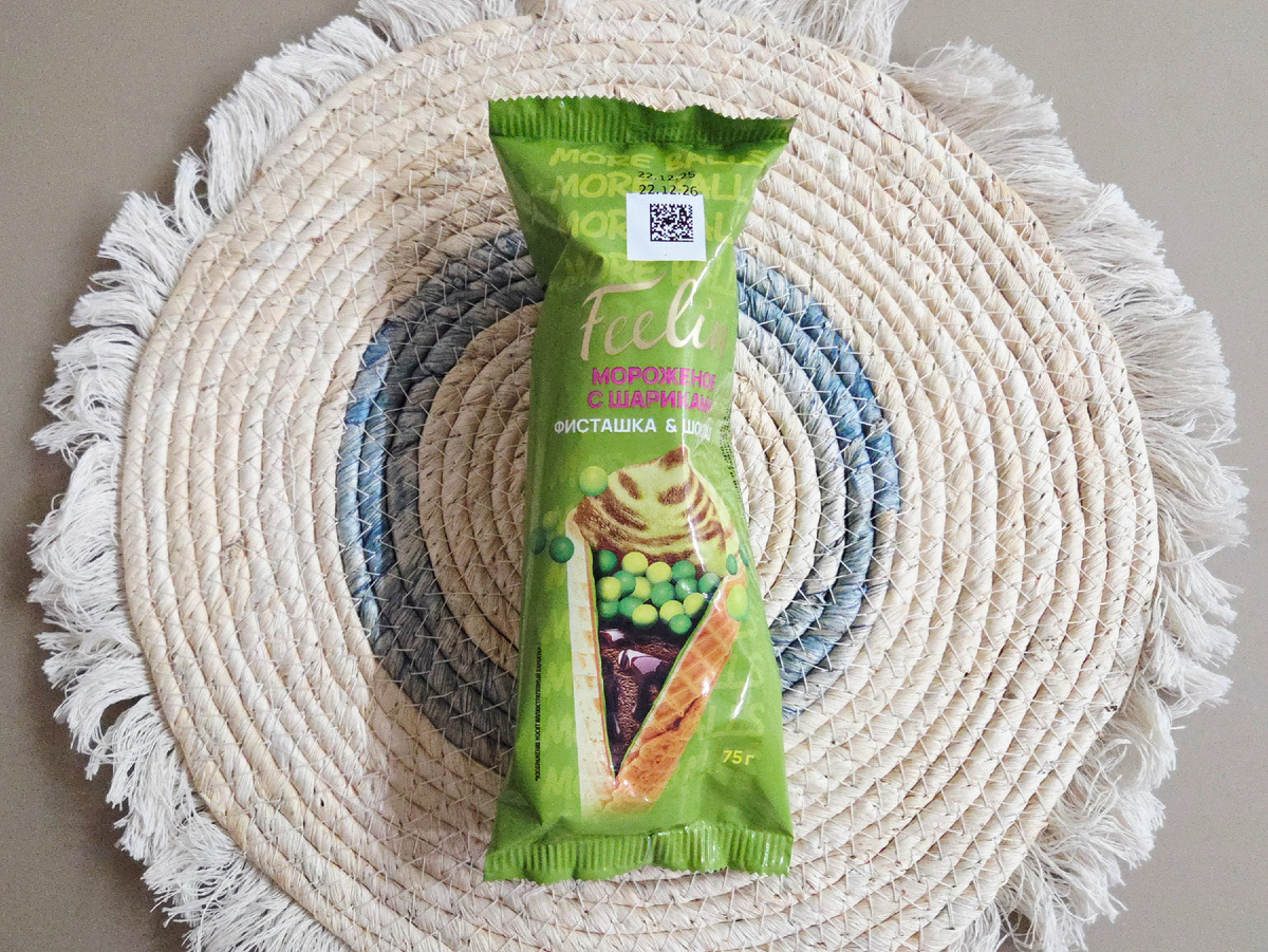 Нашумело мороженое так нашумело. Когда был тот самый трендовый ажиотаж, его не было в ближайших двух КБшках. Сейчас вагон и маленькая тележка во всех магазинах. Да еще и в двух вариантах. Думала, что просто вид мороженого один, а исполнение разное, но я ошиблась. Сегодня расскажу про мороженое Feelin в виде рожка. Вафельный рожок Feelin со вкусом фисташки с рисовыми шариками. Знакомое лакомство в новом формате! 🍦Бренд Feelin 🍦Изготовитель: Беларусь, ООО Нордар Обалдеть, оно даже не российское. Я, если честно, думала, что его производят где-нибудь под Ярославлем или Воронежем 😁. А нет, везут с самой Беларуси. 🍦Масса нетто 75 г Feelin в рожке с шариками, меня, конечно совсем не покорило и не удивило. Обычно я достаю мороженое и спокойно ем, выбросив фантик. Но тут как знала, поставила тарелку. Обрезала фантик по краю и достала... один рожок. Шапка мороженого осталась в пакете🤦♀️. Она просто отвалилась. И я ее понимаю! Ей просто стало стыдно. А за что ей там держаться, если шари