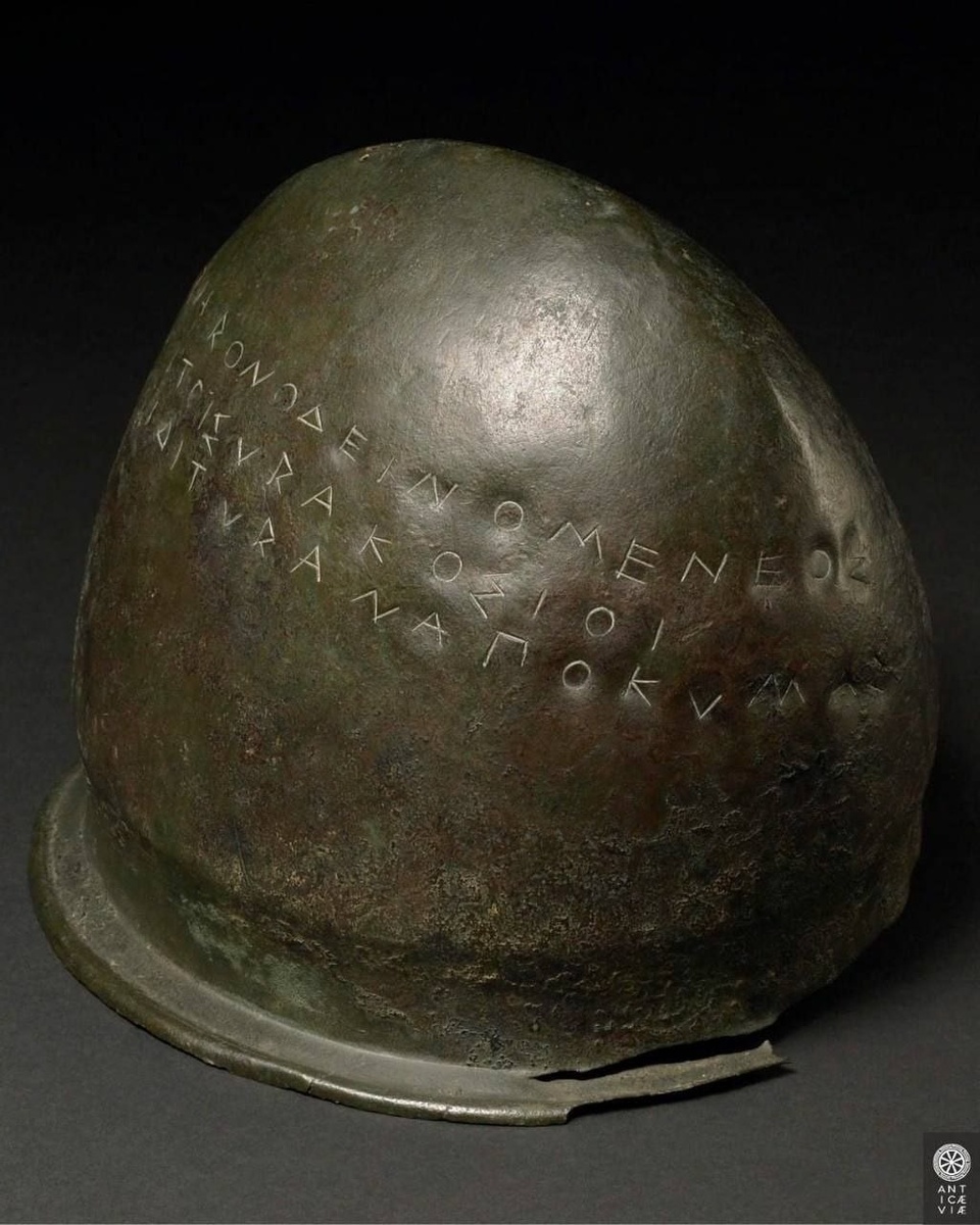 ! 🏺 Этот шлем был привезен греками из Сиракуз (Сицилия) в дар храму Зевса в Олимпии. И знаете, почему? Все дело в том, что они решили поблагодарить Зевса за свою блестящую победу над флотом этрусков при Кумах в 474 году до нашей эры! 🎉 Так что, если вы когда-нибудь увидите этот шлем, знайте, что он не просто аксессуар, а настоящий свидетель исторической драмы!