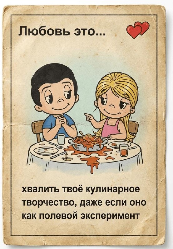 Сгенерировать фото⚡️ Перейти в бота 🤖 Гиперреалистичное, детализированное фото винтажного вкладыша от жевательной резинки “Love is…”. Слегка мультяшная иллюстрация милой пары по референсу: они оба (черты лица 1:1 с референсом) сидят за столом, уставленным тарелками. Парень с восхищением смотрит на девушку, которая с гордым видом указывает на самое бурное и залитое соусом блюдо. Надпись: “Любовь это… хвалить твоё кулинарное творчество, даже если оно выглядит как полевой эксперимент”. Высокое разрешение, профессиональное студийное освещение, малая глубина резкости. Чистая открытка без фона.