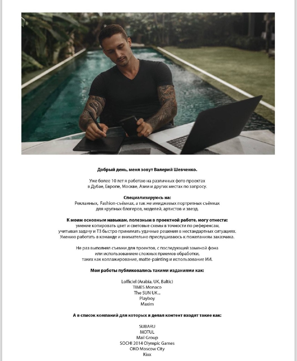 … по всем 6ти отписавшимся человекам😂🕯️🕯️🕯️🕯️🕯️🕯️ всем оставшимся респект, вы лучшие 🫶🏻 для вас тут будет очень много полезного. Мне вообще не жалко делиться инфой бесплатно… Добавил к сообщению скрин из своей презентации фотографа 4-летней давности, с кейсами и прошлым опытом)) вдруг кто то не в курсе, что у меня за плечами… Так то уже 14 лет в фотографии. 13 лет в обучении. 8 лет - международный уровень. 3 года жил в Дубае, 3 года на Бали, несколько месяцев в ЕС, США и др местах. При всем при этом я из маленького города РБ🇧🇾 79к населением 🤷♂️ Благодарен вам за то, что следите за мной и моим опытом. Рад быть полезным🙌🏻 И это конечно хорошо… уроки и лекции смотреть, лучше чем ничего! Но это☝🏻 не про результат... Знания в чистом виде — мало что дают на деле… 85% быстрых результатов в РАЗБОРАХ от значимых экспертов 👌🏼📈