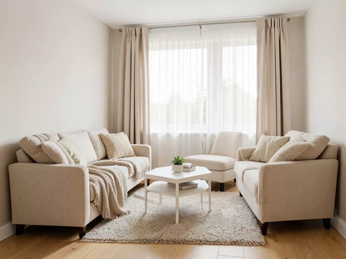 Яркий пример — покупка слишком компактного ковра. Если под покрытием не скрываются хотя бы передние опоры дивана и кресел, оно визуально дробит пол и делает комнату уже. Ковровое изделие призвано собирать уголок отдыха в единое целое, а не одиноко лежать посреди свободного места. Вторая частая оплошность — полный отказ от тёмных деталей. Глазу необходима точка опоры. Без лёгкого контраста обстановка расплывается. Добавьте пару чётких линий за счёт тёмных рам, опор столов или геометрического узора на текстиле, чтобы проступил визуальный рельеф.