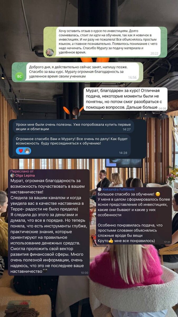 Публикую отзывы учеников первого потока обучения по инвестициям. Кто-то разобрался в основах, кто-то уже сделал первые шаги, а кто-то сформировал портфель. 4-го апреля проведу практический урок по расчету своей финансовой свободы. Буду показывать новую таблицу и делать расчеты в прямом эфире. Каждый участник получит шаблон таблицы, в которой сможет посчитать сумму для своей финсвободы. Также расскажу про программу нового потока обучения по инвестициям, которая стартует на следующей неделе. Для записи напишите мне «встреча» - @murat_dimitrov Участие бесплатное, но мест всего 50.
