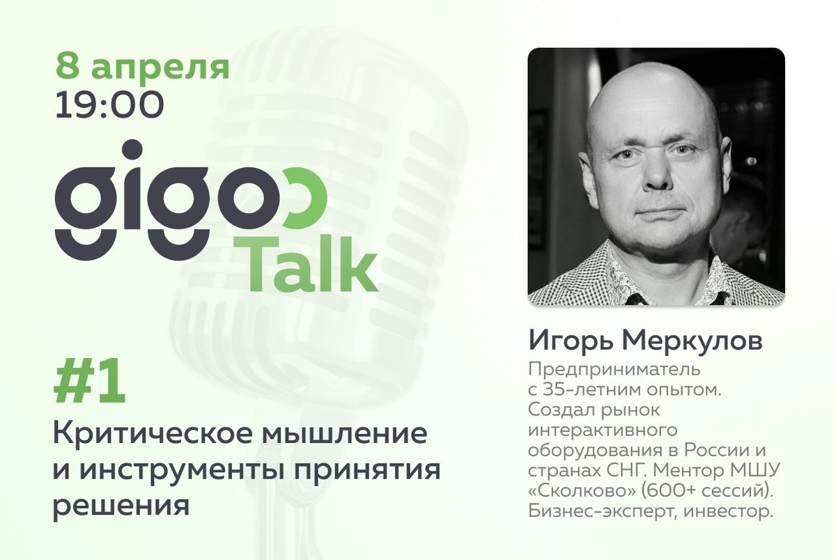 Как и обещали – анонсируем первое выступление в новом формате Gigoo Talk ⬇️ Мы привыкли думать, что принимаем решения рационально. Но на практике часто опираемся на модели реальности, которые создаёт наш мозг – и они не всегда точны. Они искажаются: 🟢 опытом 🟢 убеждениями 🟢 когнитивными ошибками ➡️ В результате даже сильные специалисты и управленцы могут: – недооценивать риски – принимать неочевидно слабые стратегические решения – ошибаться в людях и гипотезах Именно поэтому критическое мышление – это уже не «софт-скилл», а ключевой инструмент для управления, стратегии и работы с командами. 📅 8 апреля в 19:00 (МСК) приглашаем вас на первый Gigoo Talk 🧑💻 Спикер: Игорь Меркулов – предприниматель с опытом 35+ лет (создал рынок интерактивного оборудования в России и странах СНГ) – наставник программ Практикум и Upgrade МШУ «Сколково»: 600+ сессий с топ-менеджерами – бизнес-эксперт и инвестор (8 новых проектов за последние 2 года) – автор образовательных программ На встрече ра