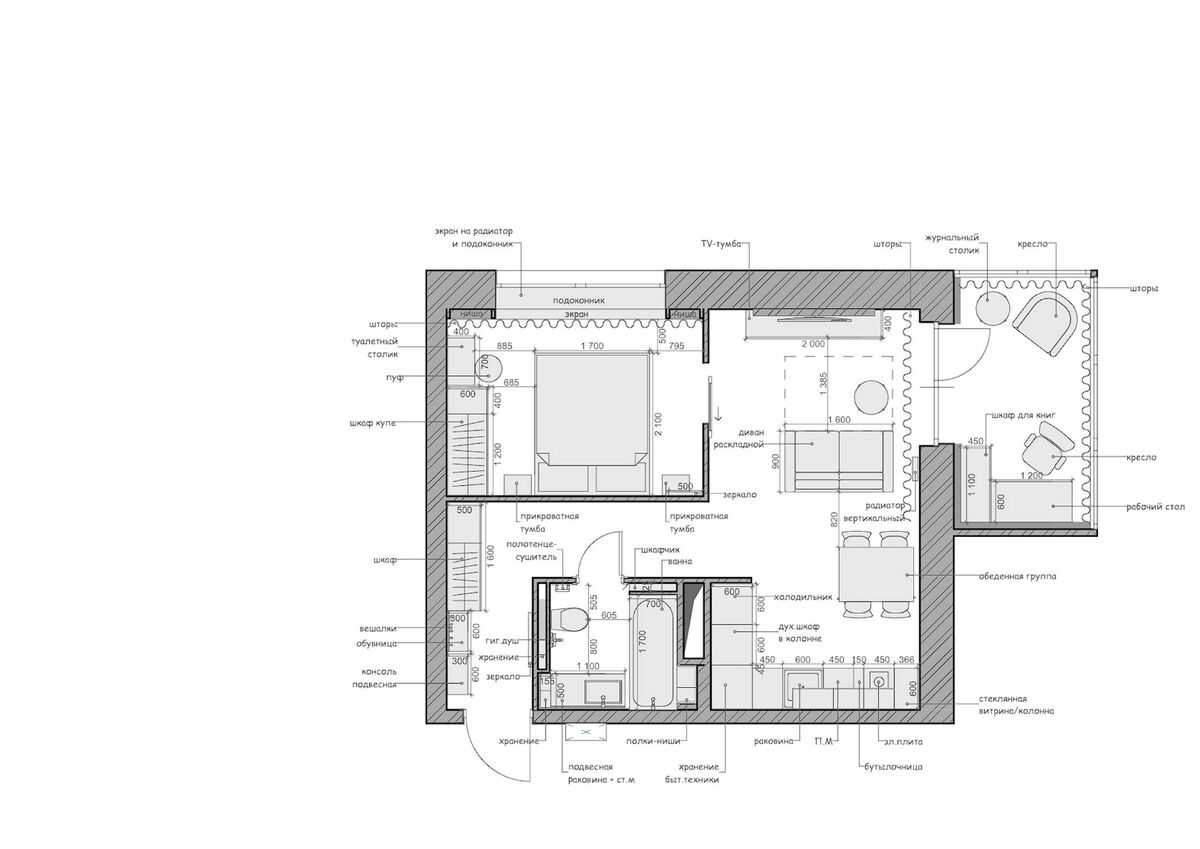 Тип проекта: полный комплект чертежей с визуализацией и подбором мебели ПЛАНИРОВОЧНОЕ РЕШЕНИЕ Так как квартира предназначена для постоянного проживания, нужно было сделать ее максимально функциональной и уютной, чтобы был уголок как для работы, так и для отдыха. Нам удалось разместить все необходимое для комфортного проживания, приема гостей и рабочую зону. ПРИХОЖАЯ От застройщика мы получили узкую прихожую, где было достаточно непросто разместить все необходимо, но мы справились. Мы смогли вместить большой шкаф для верхней одежды, секцию под хранение бытового инвентаря и робота-пылесоса, банкетку, крючки быстрого доступа. а также подвесную консоль. КУХНЯ-ГОСТИНАЯ Акцентом всей кухни является шкаф с подсветкой он дает воздуш