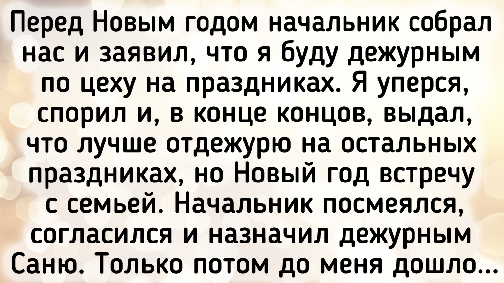 После окончания института устроился работать на металлургический завод. Я на тот момент был уже женат и имел ребенка, а со мной на завод пришел сокурсник-холостяк Саня. Перед Новым годом начальник собрал нас и заявил, что я буду дежурным по цеху на праздниках. Я уперся, спорил и, в конце концов, выдал, что лучше отдежурю на остальных праздниках, но Новый год встречу с семьей. Начальник посмеялся, согласился и назначил дежурным Саню. Только потом до меня дошло, что своей неосторожной фразой я для начальника на весь год решил головную боль с дежурствами. © Alek62 / Pikabu