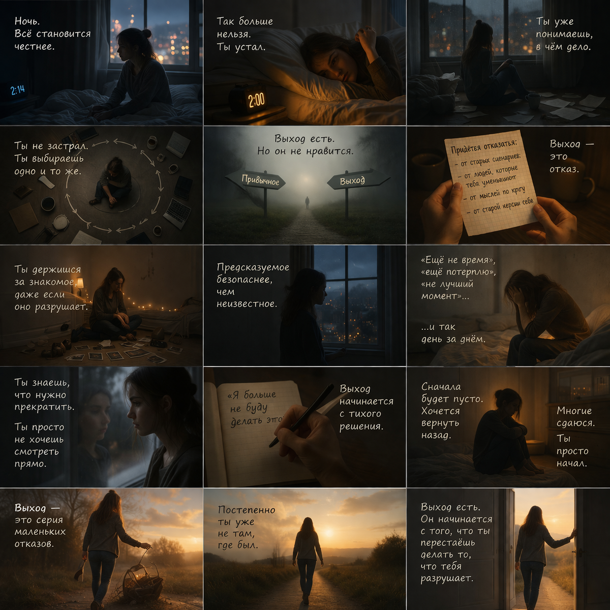 Самое важное - ты уже знаешь, о чём это для тебя. У каждого это своё. Но это знание есть. Вот почему ночью так сложно уснуть. Потому что в тишине невозможно от него спрятаться. Днём ещё можно отвлечься, но ночью остаётся только честность. И в этой честности есть неприятная, но освобождающая мысль: можно выйти. Он не сложный. Он не где-то далеко. Он начинается с того, что ты перестаёшь делать то, что тебя разрушает. И, возможно, ты ещё не готов. Возможно, ты ещё немного побудешь там, где есть. Но теперь ты уже не сможешь сказать, что не понимаешь. Потому что ты понимаешь. И рано или поздно тебе придётся сделать этот выбор.