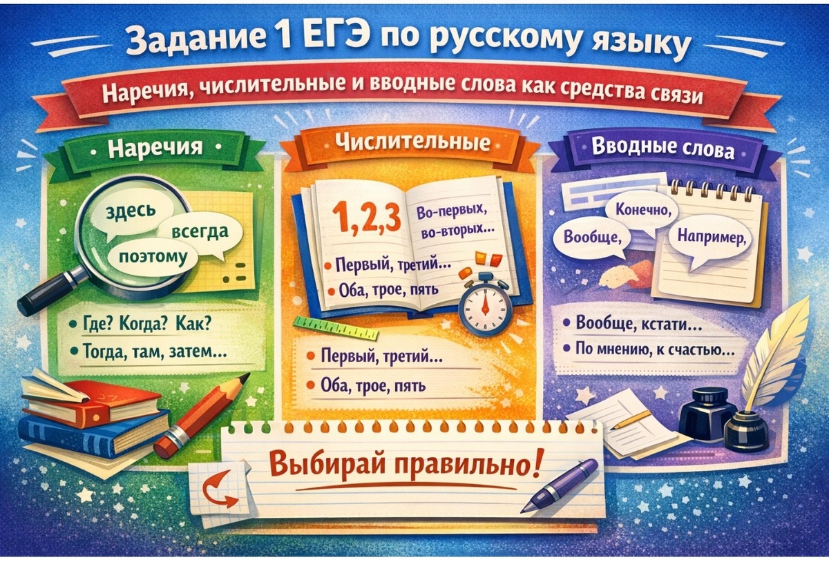 Успешная сдача ЕГЭ по русскому языку требует от выпускника не только грамотности, но и понимания логико-грамматической структуры текста. Задание 1 проверяет умение правильно подбирать средства связи между предложениями. Как показывает практика, наибольшие трудности вызывают такие части речи, как наречия, числительные и вводные конструкции. В данной статье мы разберем классификацию этих элементов, их морфологические признаки и синтаксические функции, необходимые для безошибочного выполнения задания на ЕГЭ. Наречие — это самостоятельная часть речи, обладающая признаком неизменяемости. Оно может обозначать признак действия, предмета или другого признака. Наречия не склоняются и не спрягаются, что является их ключевым отличительным свойством. В рамках Задания 1 ЕГЭ важно различать наречия по их функциям и значениям. Для правильного подбора слова в контекст задания необходимо учитывать семантику: Важное примечание:Наречия «где», «когда», «как», «почему» и «отчего» — единственные в своем кла