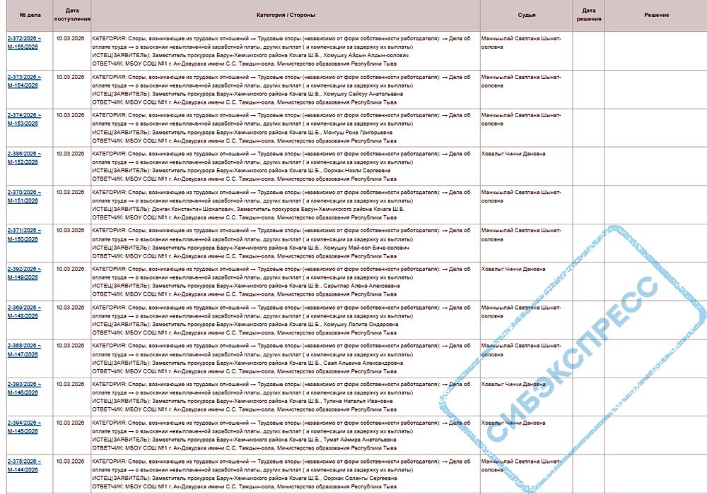 В марте 2026 года сотрудники школы №1 тувинского города Ак-Довурак подали не менее 22 исков по поводу зарплат или других выплат, которые им задержали или выдали не полностью. Это следует из электронной картотеки Барун-Хемчикского районного суда республики, обратил внимание «Сибирский экспресс». Ответчиками проходят школа и министерство образования Тувы. Иски работников учреждения сопровождает прокуратура. Кроме того, в середине 2025 года в Бай-Тайгинский районный суд поступило ещё 26 исков, касавшихся зарплат, от сотрудников Тээлинской средней школы. Производство по всем делам вскоре прекратили (второй скриншот). В ноябре 2025-го коллективные иски подали уже сотрудники Хемчикской, Кызыл-Дагской и Бай-Талской средних школ. Требования о выплатах предъявили ещё почти 90 человек. В общей сложности только в двух районах Тувы в 2025–2026 годах, по нашим подсчётам, требования по выплатам предъявили к школам не менее 150 человек. 📌 Учительница русского и литературы одной из школ Бай-Тайг
