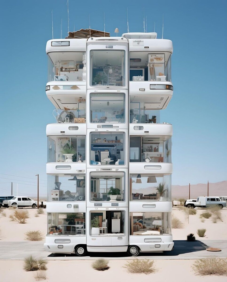 Берлинская студия Ulises Design создает гиперреалистичные проекты, используя нейронную сеть Midjourney. Их новое творение - многоуровневые жилые фургоны, выглядящие, как роскошные особняки. Идея создания более чем двухуровневого жилого пространства на шасси фургона представляет собой сложную задачу, требующую очень прочной платформы и необычного комплекта шин, чтобы выдержать такой вес. Однако искусственный интеллект позволяет нам мыслить нестандартно и создавать что-то