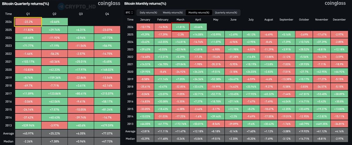 🧐 Биткоин закрыл первый квартал снижением на 22,4% – худший результат для Q1 с 2018 года.
