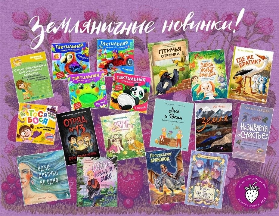 ! Весна радует первым теплом, пением птиц, капелью, первоцветами и новыми земляничными книгами. 🔸0+ По традиции начнём с самых маленьких читателей. Предлагаем их мамам «Стихи-помощники для развития малыша», которые помогут укрепить контакт с ребёнком. Стихи Ирины Асеевой можно читать во время кормления, одевания и купания. Серия тактильных книг от Юлии Весовой «Машинки», «В зоопарке», «Животные», «Питомцы» – это первое знакомство ребёнка с окружающим миром и проверенный способ развить мелкую моторику, внимание, мышление, речь и слух с помощью различных текстур, мягких вставок и весёлых стихов. Детям от 2 лет понравится добрая и смешная история Юлии Весовой «Тося-Бося и таинственный Никто» о детской фантазии и маленьких шалостях, которая покажет, что важно не бояться признаваться в своих проступках. И, конечно, ребят не оставит равнодушными яркая история «Птичья стройка» от Екатерины Земляничкиной и Ольги Вербицкой. У Скворца скоро вылупятся четыре птенца! Нужно срочно построить д