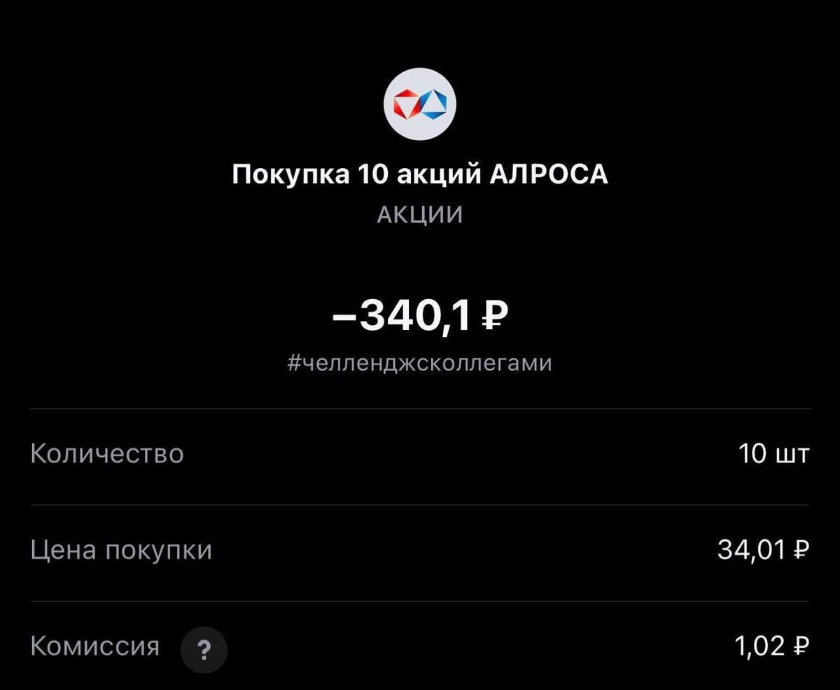 ! Сегодня покупка #388 Статистика портфеля на стороннем сервисе, можно посмотреть по "ссылке" Напомню это челлендж с коллегами, каждый рабочий день пополняем брокерский счет на 250 рублей и инвестируем. Если возникли вопросы или есть не понимание, что делать. Задавайте «тут» Покупка #388 🟢 “АЛРОСА” 34.01 rub #ALRS 1 лот #каждыйсможет #челенджсколлегами TG MAX