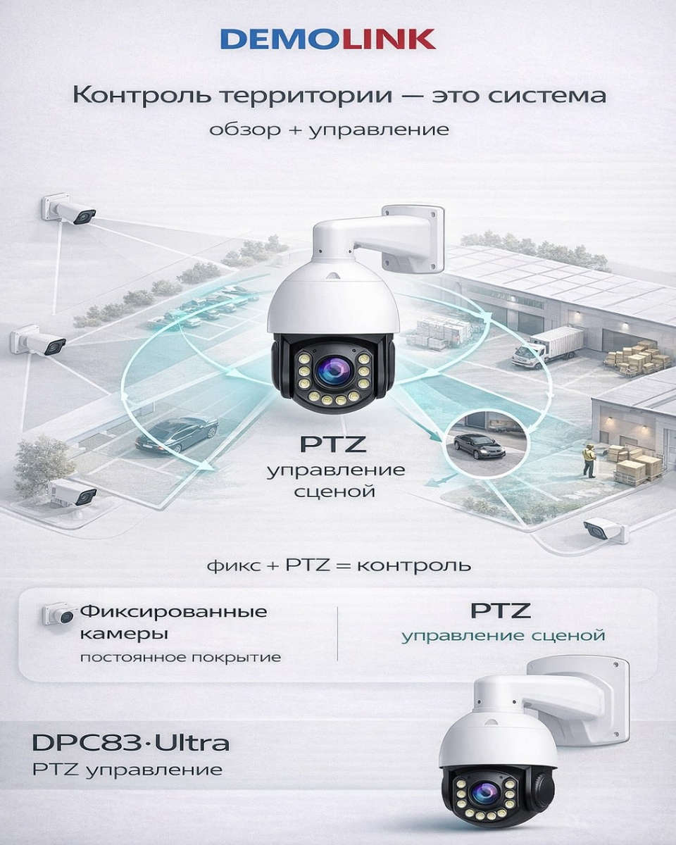Видеонаблюдение на большой территории — это уже не про камеры. Это про то, как система управляет сценой. Когда объект становится большим, наблюдение перестаёт быть набором отдельных точек. Сцена распределяется: 🏭 производственные зоны 🚗 парковки 📦 складские участки 🚉 транспортные направления События возникают в разных местах — и система должна уметь работать с этой динамикой. Фиксированные камеры создают основу: 📷 фиксируют ключевые зоны 📐 дают стабильное покрытие Но они остаются статичными. Система видит всё, но не может сфокусироваться на важном в моменте. PTZ-камера вводит в систему управление вниманием. Она позволяет: 🎯 направлять наблюдение в нужную точку 🔄 перераспределять внимание между зонами 🔍 усиливать детализацию там, где это необходимо Это уже не просто запись, а динамическая работа с территорией. DPC83·Ultra — PTZ-камера для работы в составе системы. Она обеспечивает: • поворот 360° • контроль по вертикали • оптическое приближение удалённых объектов • о