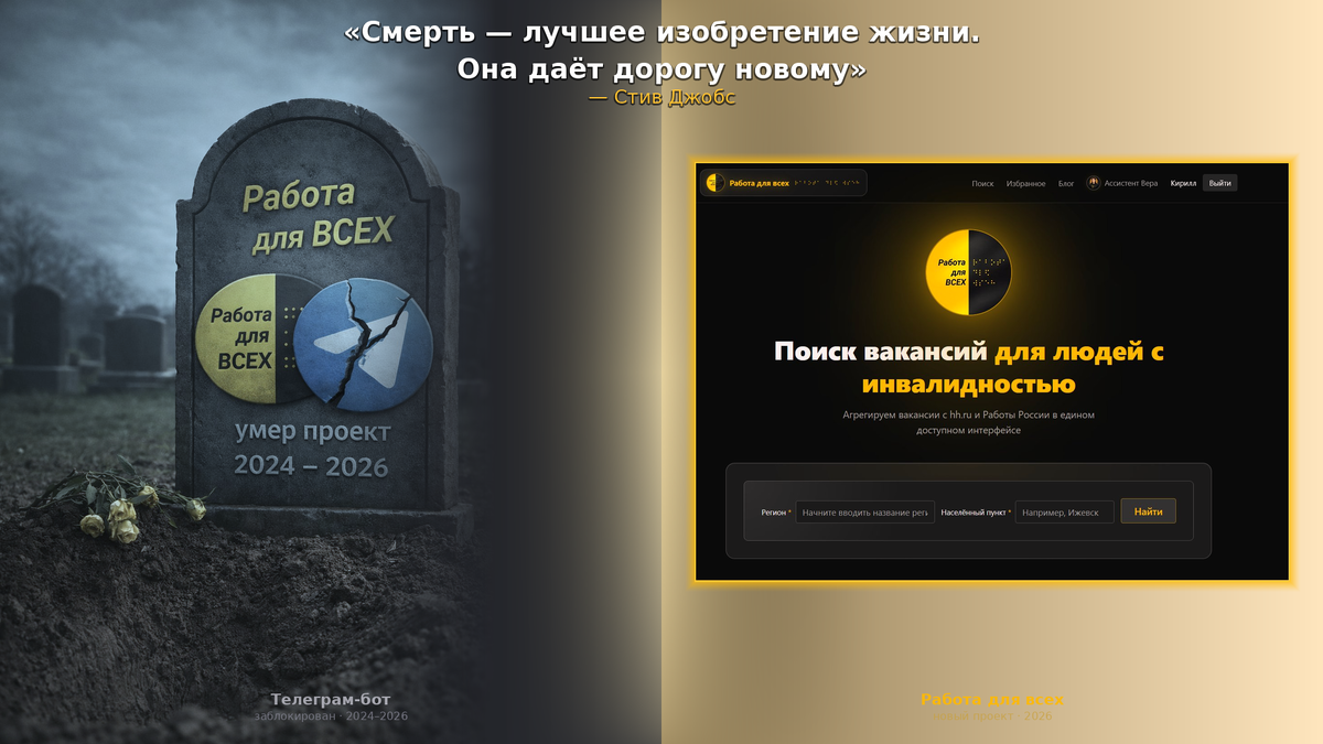 Всем привет! Давно не писал ничего, так как новостей особо не было по проекту «Работа для всех». Но сегодня я вынужден прервать молчание, чтобы сообщить печальную новость. Telegram бот «Работа для всех», который практически два года помогал людям с инвалидностью искать и находить вакансии, сегодня живет последний день. С завтрашнего дня проект будет отключен от всех систем его жизнеобеспечения. Скажу честно, мне очень жаль, но государство, по моему мнению, продолжает заниматься полной дичью, желая заблокировать все, что только можно, тем самым показывая свою слабость и беспомощность. Все вы знаете, что руки РКН дотянулись до Telegram. Нет Telegram – нет и удобных и доступных сервисов, которые были построены на его платформе. Это касается и моего Telegram бота «Работа для всех». Но давайте не унывать, все в наших руках! Я верю в лучшее, что все это когда-нибудь пройдет, и Telegram, а значит, и бот «Работа для всех» заработает вновь, и, скажу по секрету, заработает еще лучше. Однако, см
