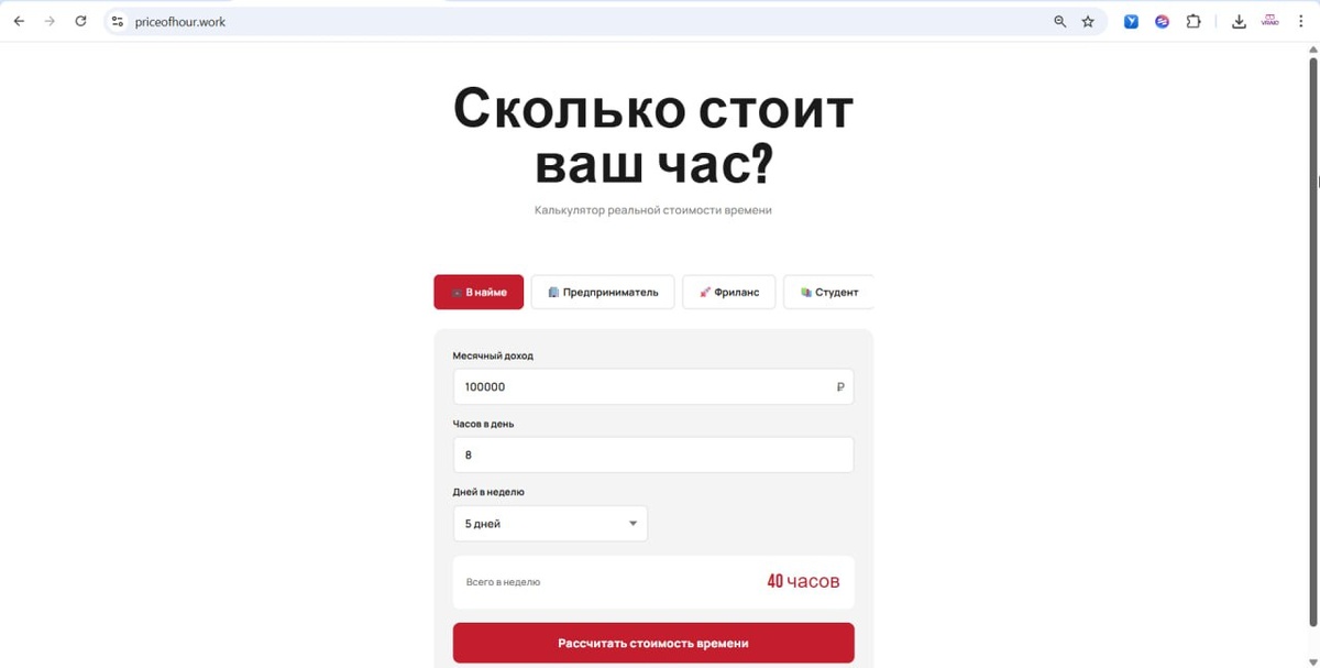 ? 🤯 Сегодня вы ушли на работу и вернетесь домой в районе 7-8 часов вечера. Завтра ваш день повторится. И так еще лет 20. А при этом ваш день, который больше никогда не повторится, может стоит 2-3 тыс рублей... Звучит страшно, правда? Провести жизнь в повторяющейся рутине, даже не получив за нее достойную оплату... 💔 Подготовила для вас платформу, на которой вы можете посчитать, сколько стоит ваш час 👉 ЗДЕСЬ Пользуйетесь, если не боитесь увидеть жестокую правду. Правда, после этого вы вряд ли захотите жить так и дальше. Но это к лучшему! 🙏
