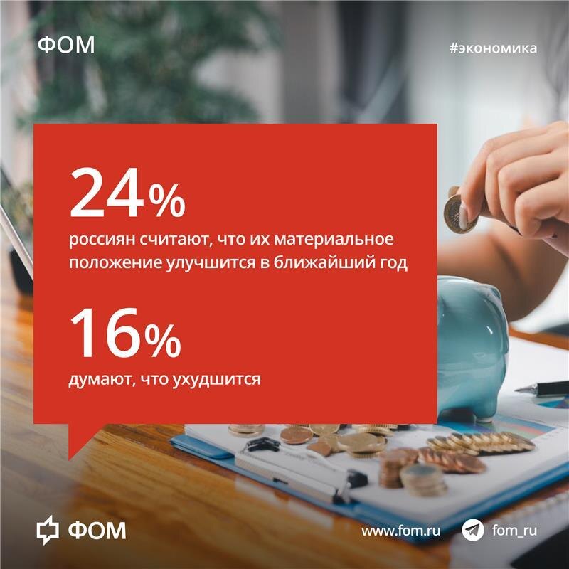 По данным опроса ФОМа, хорошим сейчас свое материальное положение считают 23% россиян, плохим – 19%. Большинство (55%) оценивают ситуацию со своими доходами как среднюю. 9% опрошенных отметили улучшение своего материального положения за последние два-три месяца, 25% – ухудшение, а 64% не заметили изменений. 24% респондентов надеются, что в ближайший год их финансовое положение улучшится, 16% ожидают ухудшения, 38% не ждут изменений, а 22% затрудняются дать прогноз. Подробнее: fom.ru #экономика #финансы #доход #материальноеположение 📲 ФОМ в МАХ 📱 Фонд Общественное Мнение