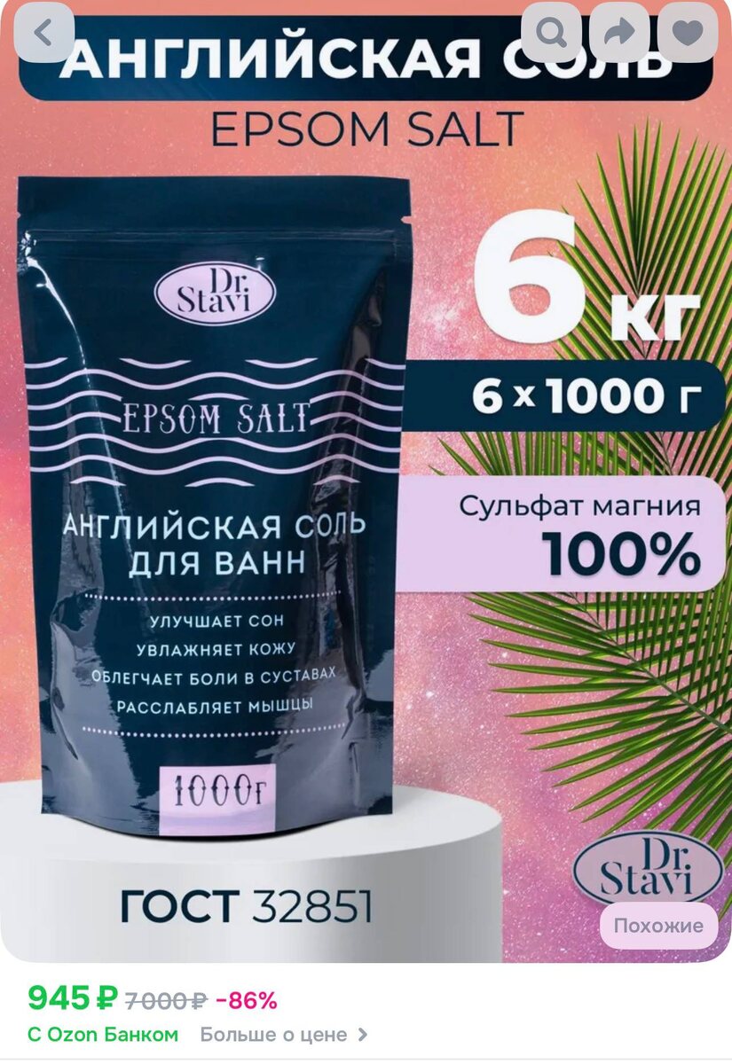 Эпсом соли, наткнулась на озон 6 кг, практически за 945₽ Я всегда брала пачку, как на 2 фото. Но сейчас увидела эту. Цена сказка. Надо брать. В поиске вбивала эпсом соль. Вы же знаете, что полежав в такой ванной, вы снимаете раздражение, усталость. Плюс в бане такое скрабирование- шик! По причине, что магний и через кожу впитывается+ скраб отшелушивание старых чешуек кожи, ну и работа с лимфой. А если еще и ЭМ добавить по принятии, то такая ванная, спасут вас от состояния «злобной тети» Полезно = 💖