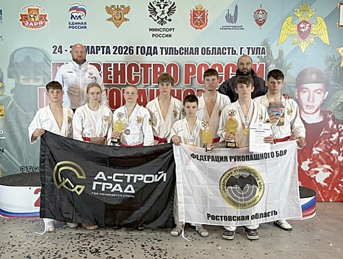 Воспитанники аксайской спортивной школы «Юность» успешно выступили на Первенстве России по рукопашному бою, которое завершилось в Туле. Соревнования, собравшие более тысячи сильнейших бойцов со всей страны, проходили с 25 по 29 марта. / ФОТО Администрации Аксайского района Спортсмены из Аксая выступали в составе сборной Ростовской области и завоевали три медали. Золото в возрастной категории 16–17 лет (вес 57 кг) взял Андрей Мамулов. Серебро у Ильи Комаркова (14–15 лет, 57 кг), а бронза – у Ивана Клопова (14–15 лет, 44 кг). Несмотря на высокую конкуренцию и тяжелые поединки, ребята смогли подняться на пьедестал и принести победные очки донской сборной. Их подготовили тренеры Сергей Гладких и Александр Денекин. По итогам турнира сборная Ростовской области заняла первое место в командном зачете среди юношей и девушек 14–15 лет и третье место в категории 16–17 лет. Команда выражает благодарность генеральному директору «А-строй град» Александру Бойцуну за помощь в организации поездки на с