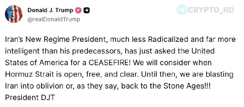 Только что он попросил Соединенные Штаты о ПРЕКРАЩЕНИИ ОГНЯ! Мы рассмотрим это, когда Ормузский пролив будет открыт, свободен и безопасен. До этого момента мы будем уничтожать Иран полностью или, как говорится, «отправим его обратно в каменный век»!!! Crypto Headlines