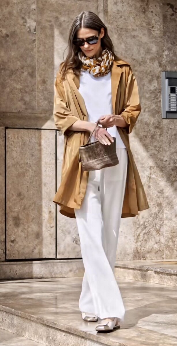 Куртка верблюжьего цвета и белый низ - для утра, когда времени в обрез.