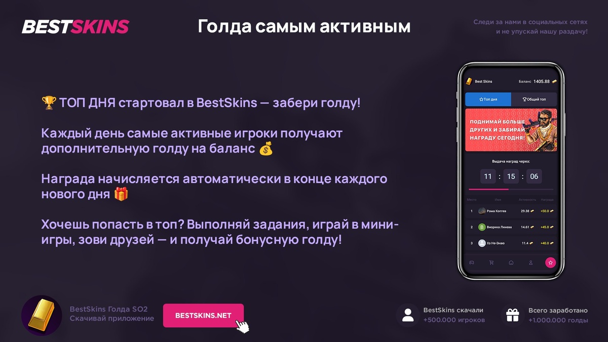 Каждый день — бонус голды за активность! 💎 Чем выше в списке — тем жирнее награда 📈 🚀 Заходи и проверь своё место в ТОПе! 📲 Скачать - https://bestskins.net