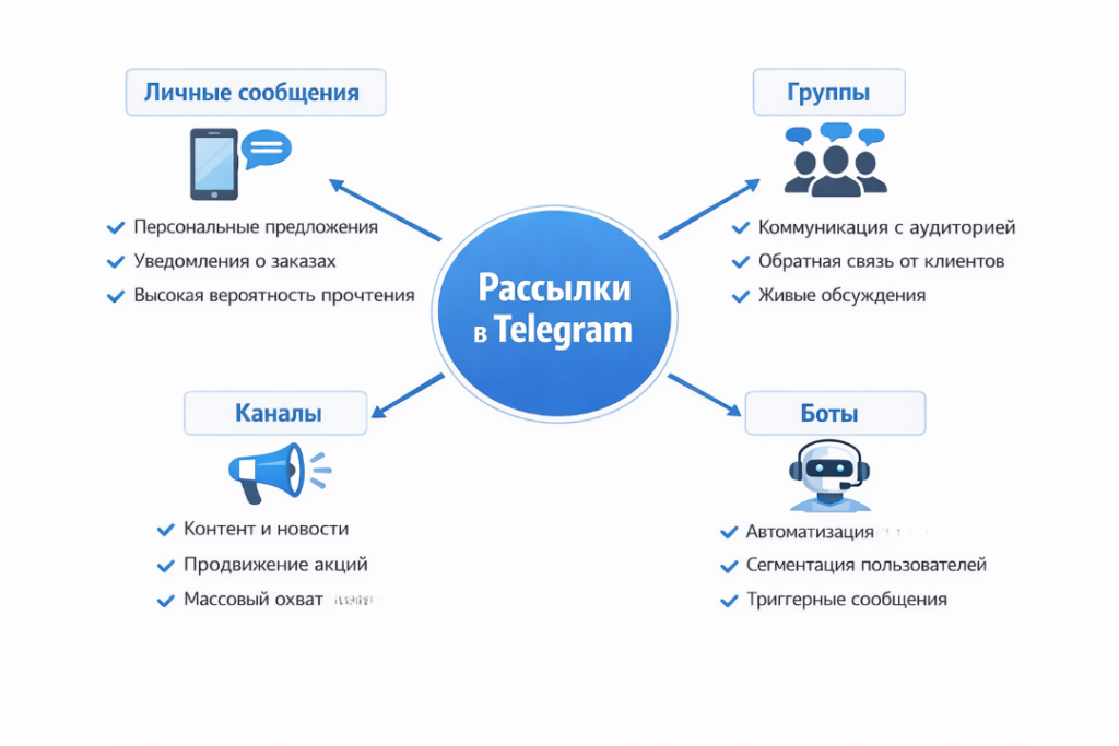 Существует несколько способов настроить рассылку сообщений в Telegram. Выбор подходящего формата зависит от задач бизнеса, размера аудитории и желаемого типа коммуникации с клиентами.
