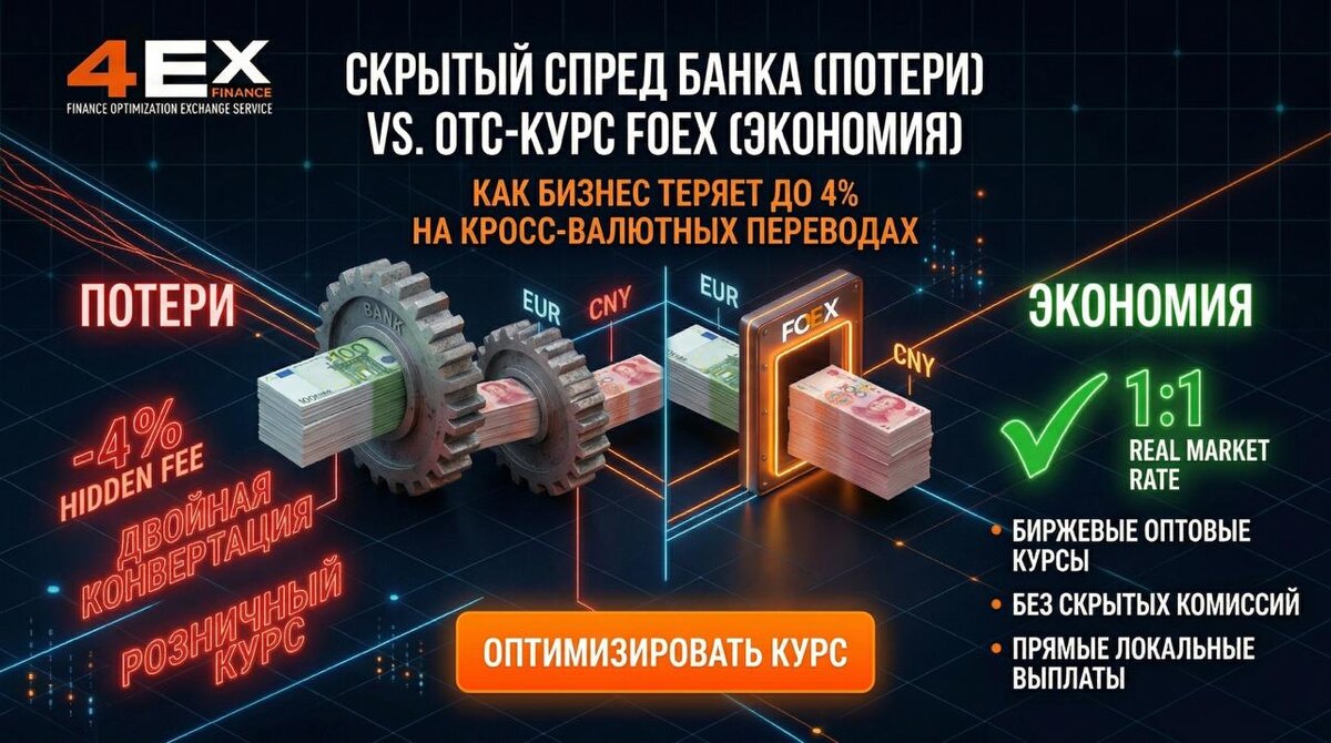 Вы заключаете контракт с поставщиком из Китая на 1,000,000 юаней (CNY). На вашем корпоративном счету лежат евро (EUR). Вы нажимаете «Оплатить», банк списывает символические €30 за SWIFT-перевод. Вы думаете, что сделка прошла выгодно. А теперь откройте биржевой график (Forex) и посчитайте реальный курс, по которому банк конвертировал ваши евро в юани. Вы обнаружите, что недосчитались от $3,000 до $5,000. 📉 Как работает скрытый банковский налог (FX Spread)? Банки обожают кросс-валютные платежи (когда валюта отправления не совпадает с валютой получения). Это их главная золотая жила. 1️⃣ Двойная конвертация без вашего ведома: Если вы платите из евро в тайских батах или дирхамах, классический банк не меняет их напрямую. Он конвертирует EUR в USD (через банк-корреспондент), а затем USD в целевую валюту. На каждом этапе откусывается комиссия. 2️⃣ Розничный курс для бизнеса: Банки покупают валюту на межбанке по оптовой цене, а вам продают по розничному внутреннему курсу (Spread). Разница