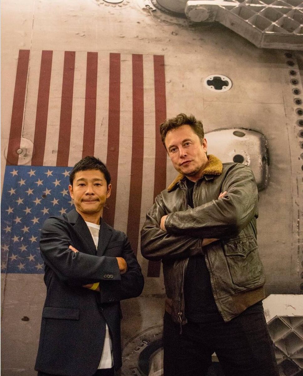 Но это еще не все. Он планировал отправиться вокруг Луны на корабле Илона Маска, финансировал проект, они тут на фото. Юсаку хотел с собой взять команду из художников.