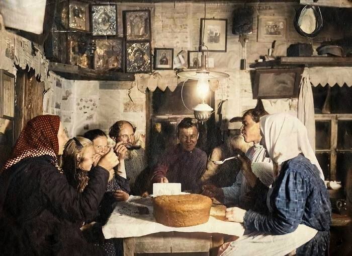 ! 🍽️ Все собрались за столом, где пахнет свежим хлебом и картошкой. Отец рассказывает о своих трудностях на поле, а дети, конечно же, перебивают его своими историями о том, как они поймали самую большую рыбу на реке! 🎣 Мать, между делом, пытается уговорить их поесть больше, ведь зима не за горами, а запасы нужно пополнять. В общем, типичный вечер в крестьянской семье, где смех и заботы идут рука об руку!