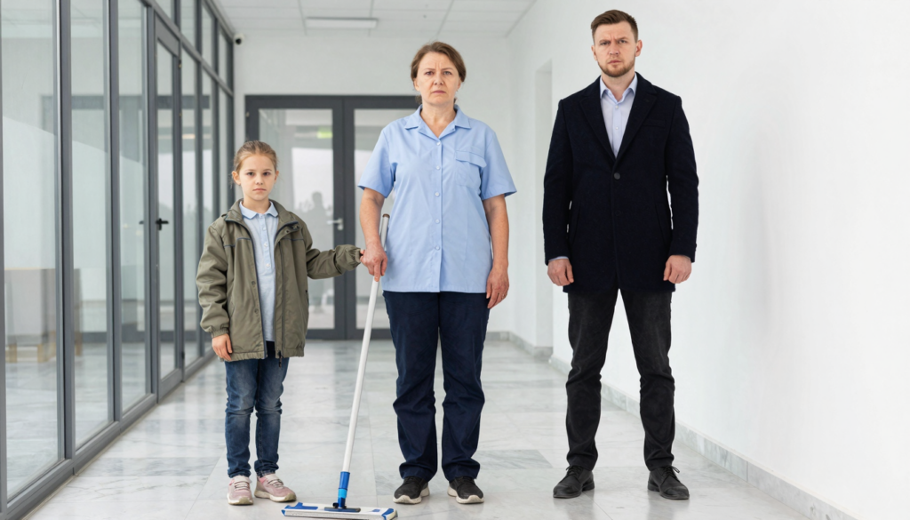 И я стояла. Мокрая тряпка в сумке, ведро у ног, дочь прижалась к моему бедру. Семь лет работы. Двадцать восемь тысяч. И вот — охрана, крики, и мою семилетнюю дочь сейчас будут отчитывать за то, что она схватила богатого человека за рукав.