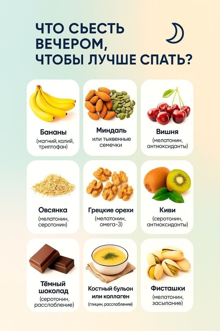 😴 Оказывается, качество сна напрямую зависит от того, что мы едим на ужин. Правильные продукты помогают расслабиться нервной системе, повышают уровень мелатонина и серотонина, даря глубокий восстанавливающий сон. ✨ В карточках собрала 9 продуктов, которые стоит добавить в вечерний рацион, если хотите просыпаться бодрыми и отдохнувшими 🍌🥝🍫