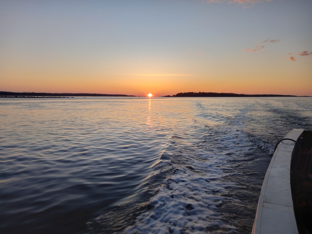 Однако, несмотря на некоторые проблемные моменты, само Белое море радовало нас своей суровой красотой и встречами с разной непривычной южанам живностью: то с развалившимся на камнях тюленем, то с прогуливающимся по берегу бурым медведем. По дороге постоянно встречались живописные каменистые островки. Гораздо реже – плавсредства, с непременно приветствующими нас пассажирами. По ходу несколько раз делали остановки в примечательных местах. Во время одной из них мне очень издалека удалось сфотографировать собакоподобное животное, которое по раскраске очень походило на совсем неожиданного в этих широтах шакала. Не берусь утверждать, что это был именно он, но запись о той встрече (со статусом надёжности определения вида «может быть») была размещена на портале «Млекопитающие России», а уже осенью на территории Республики Карелия (хотя и существенно южнее) официально был зафиксирован первый случай добычи этого «младшего брата волка».