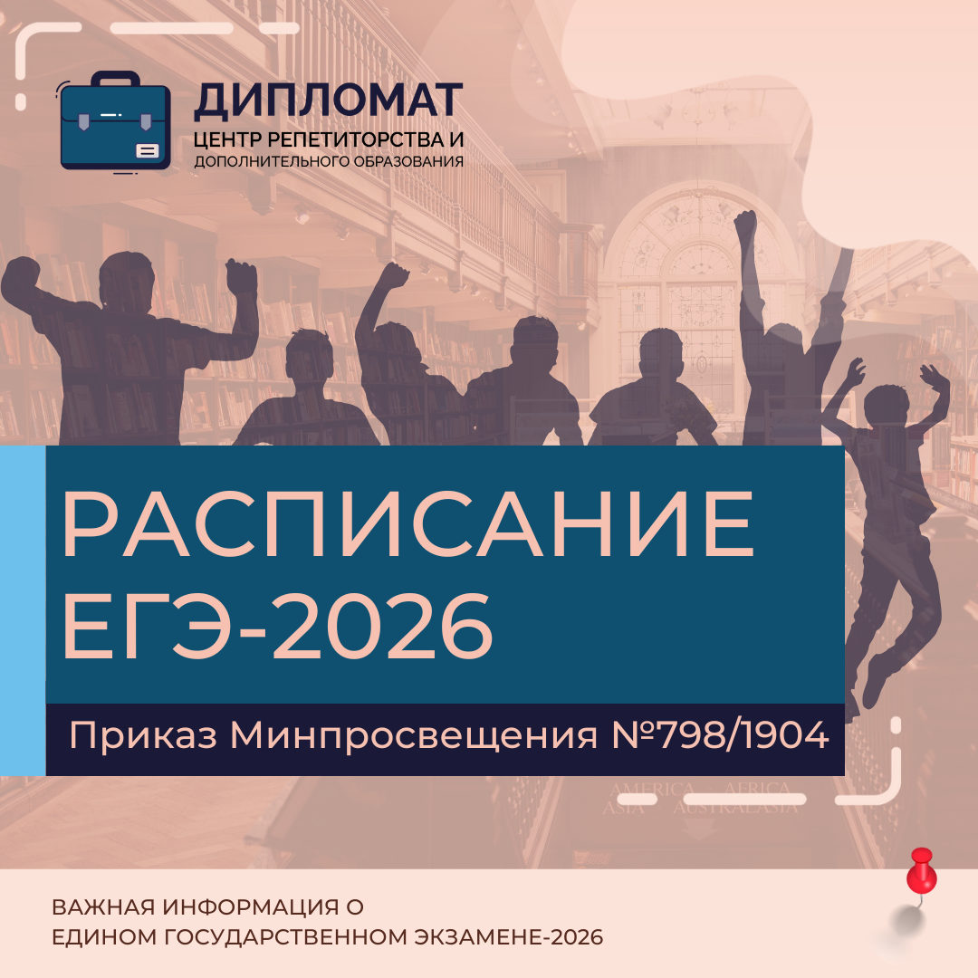 Напоминаем расписание ЕГЭ-2026, установленное приказом Министерства просвещения РФ, Федеральной службы по надзору в сфере образования и науки от 07.11.2025 № 798/1904: С 22 по 25 июня предусмотрены резервные дни сдачи экзаменов по всем предметам, 8 и 9 июля – дни пересдачи одного из предметов ЕГЭ по выбору самого выпускника до поступления в вуз. Посмотреть приказы об утверждении расписания ГИА вы можете здесь. Если вы хотите готовиться к ЕГЭ и ОГЭ с опытными преподавателями, досконально знающими предмет и готовыми терпеливо объяснять все тонкости ГИА - запись на занятия по телефону или в сообщениях группы. 🏠 Наш адрес: г. Орск, пр. Ленина, 28/ ул. Строителей, 28 ☎ 8 (3537) 32-48-37, 32-45-49, 8-922-893-25-40 📧 e-mail: centrediplomat@mail.ru Мы в MAX