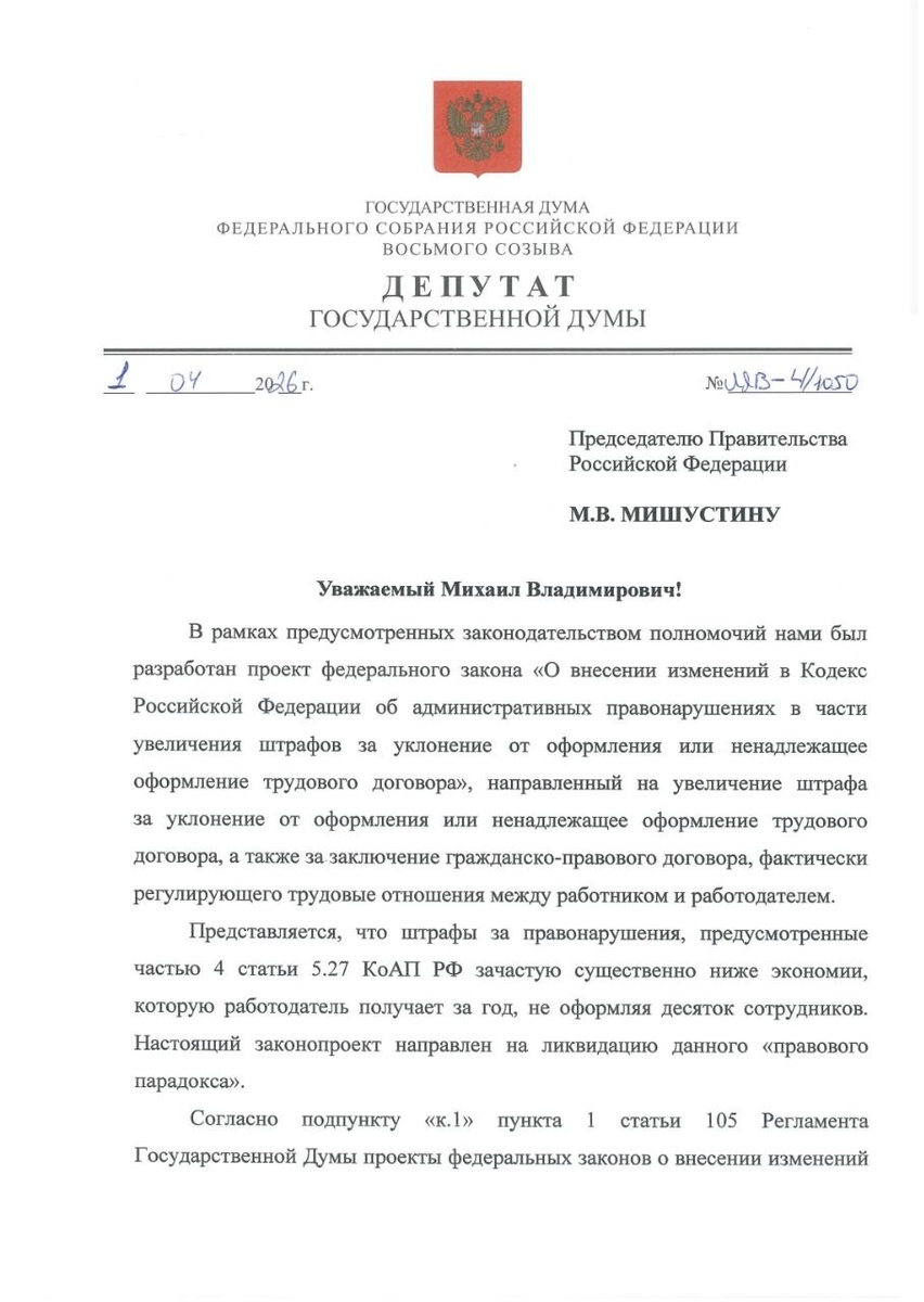 работодателей, которые нарушают правила оформления трудовых договоров. 📝Сейчас людей нередко берут на работу без официального оформления или подменяют трудовой договор гражданско-правовым. В итоге человек полноценно работает, не получая соответствующих социальных гарантий, а работодатель экономит на этом. ❗️Предлагаем вдвое повысить ответственность за уклонение от оформления трудового договора и его ненадлежащее оформление. Нынешние штрафы просто несоразмерны той выгоде, которую получает работодатель, выводя сотрудников в серую зону. Закон должен защищать работника, а не способствовать экономии на его правах! Подписывайтесь на мой канал в МАХ